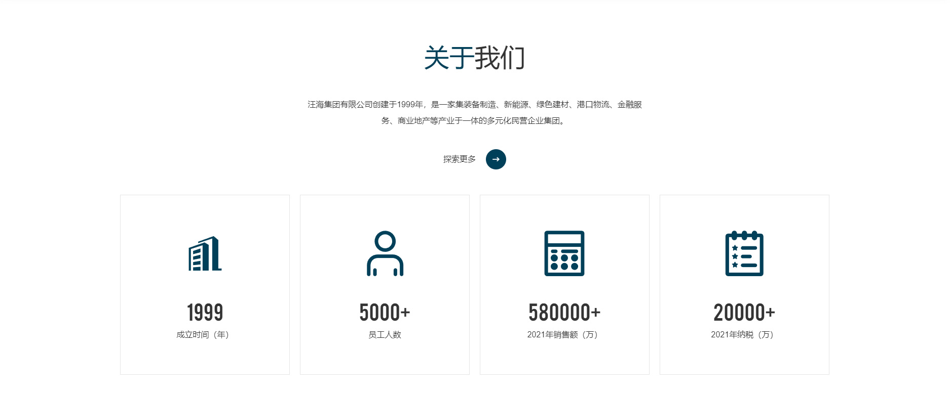 汪海集团有限公司是一家集装备制造、新能源、绿色建材、港口物流、商业地产等产业于一体的多元化民营企业集团。集团创建于1999年,总部位于南京市雨花台区,下属子(分)公司20余家,包含7大事业部:铸造事业部、电机事业部、新能源事业部、建材事业部、商业地产事业部、港口物流事业部、国际贸易事业部,业务遍布江苏、安徽、内蒙等地。