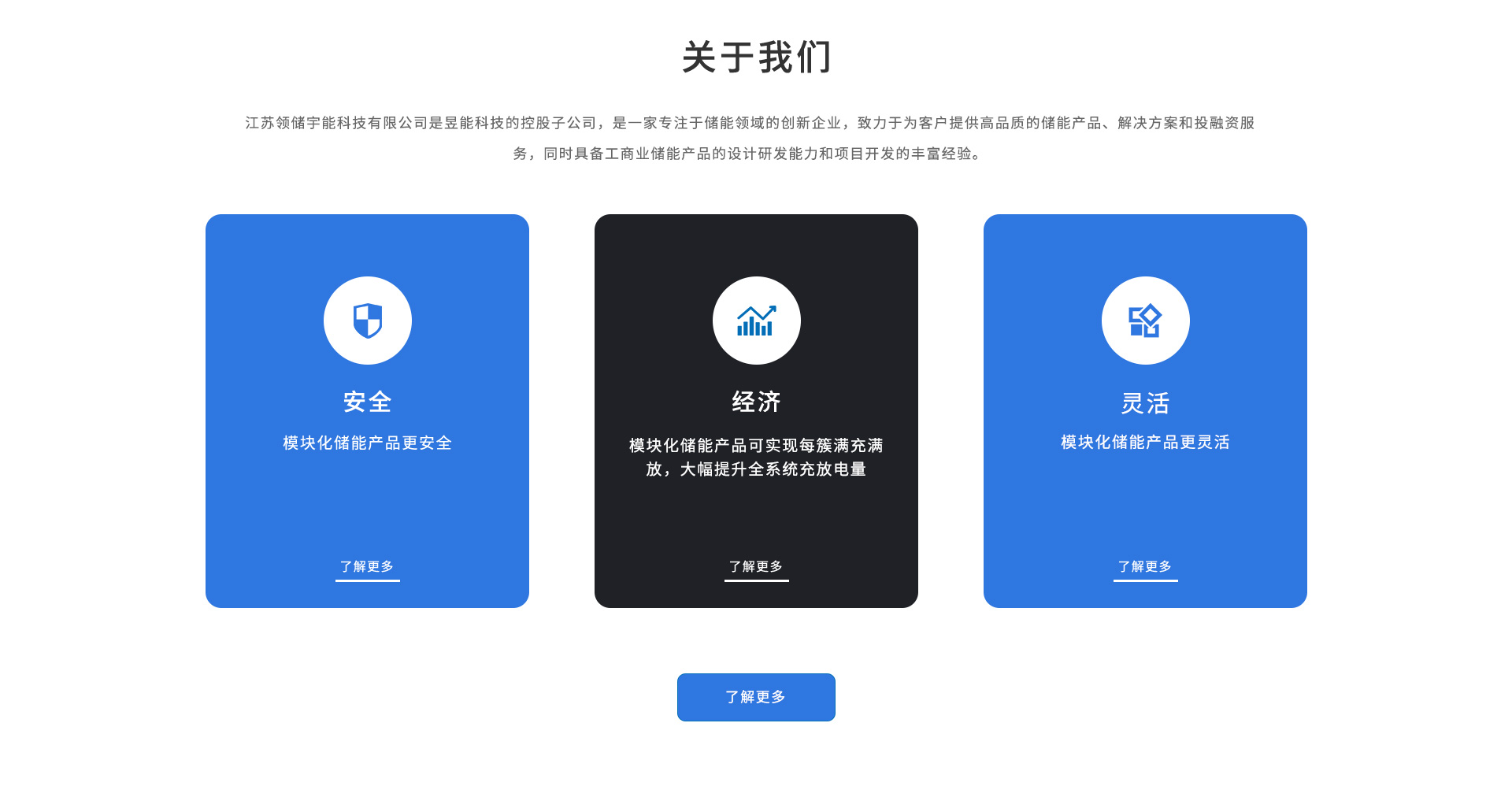 江苏领储宇能科技有限公司是昱能科技的控股子公司,是一家专注于储能领域的创新企业, 坚持为客户提供高品质的储能系统、解决方案和投融资服务,具备工商业储能系统的设计研发能力和项目开发的丰富经验,致力于成为全球领先的垂直一体化、数字化储能系统服务商。