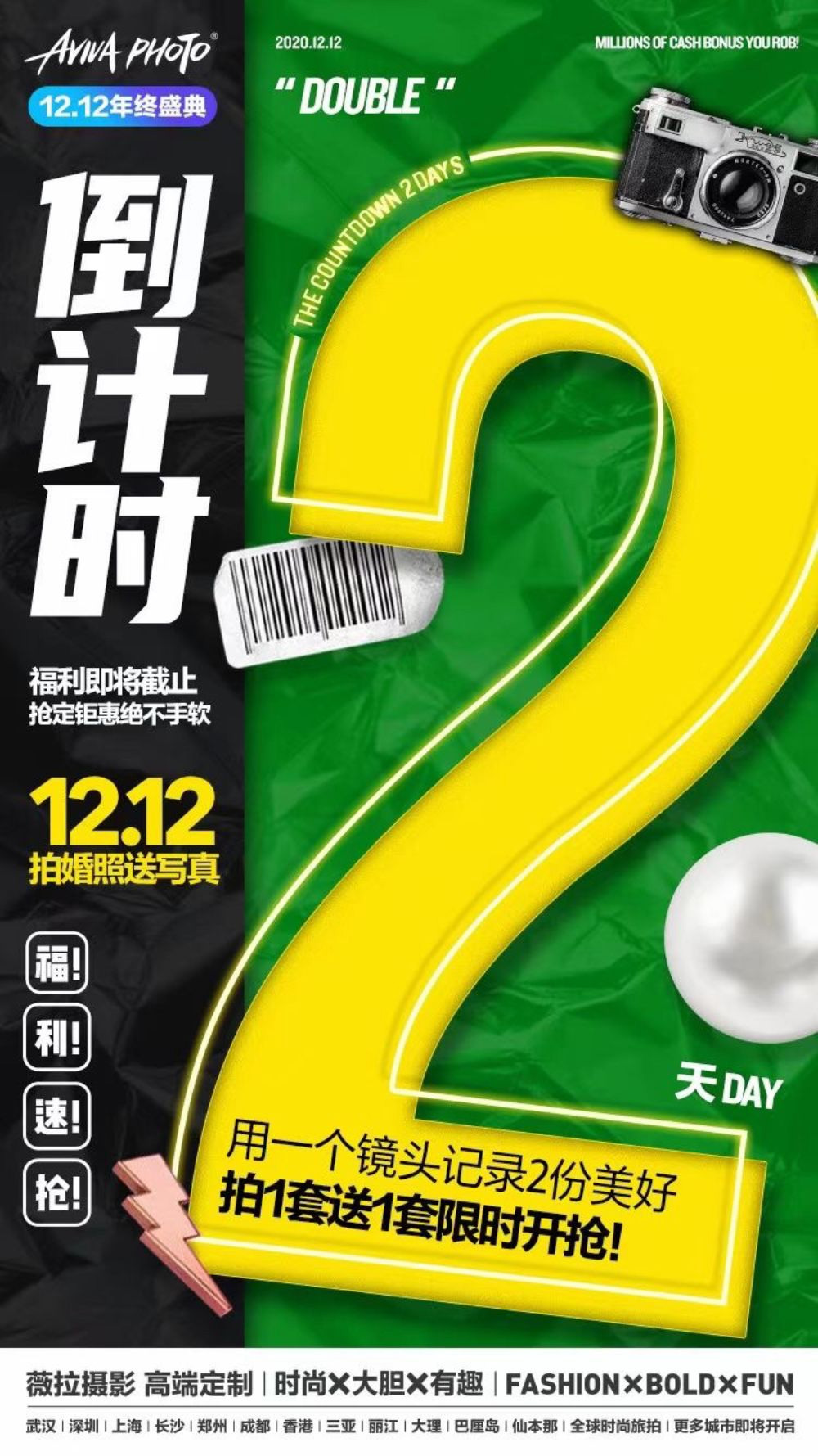 从文案内容上面分析这是一张关于拍照写真的活动海报,是关于一场双12活动海报倒计时还剩2天的活动海报,这是一家专注高端摄影的店铺,风格是时尚、大胆、有趣的写真风格,作者在版式、构图和字体上面采用的也都是符合主题风格的元素。作者很巧妙的把重要信息剩余时间2天放大非常吸引人,让人一秒关注去看其他信息。
